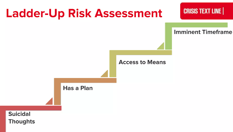 - Means – Does the texter have access to the means to carry out their plan? This step required extra care to ensure the texter’s immediate safety.